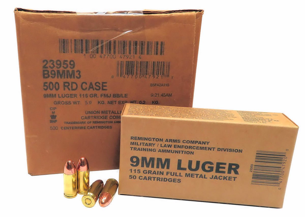 9mm 9×19 Ammo 115gr FMJ Remington Military LE Training (B9MM3) 500 Round Case