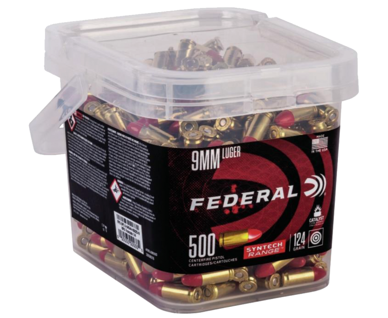 Experience a cleaner way to shoot. The exclusive polymer coating in Syntech range ammunition prevents harsh metal-on-metal contact between the bullet and bore, eliminating copper and lead fouling. Combined with clean-burning powders and the Catalyst lead-free primer, Syntech loads keep your gun cleaner, longer, so you can shoot more and shoot better. This load comes packaged in two 500 round buckets.